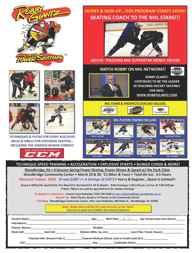 Wolfpack Families,Robby Glantz will be at the Woodbridge Community Center running his amazing power skating clinic March 29th and 30th.If you would like to register for Robby's camp please call the WCC at 732-596-4170 or email Jane.Dulemba@twp.woodbridge.nj.us.Register soon! There are only a limited number of spots available.
