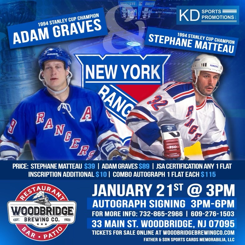 New York Rangers Adam Graves and Stephane Matteau will be hosting an autograph signing event on Jan 21st - 3pm at the Woodbridge Brewing Co. See below for more info and how to purchase tickets.