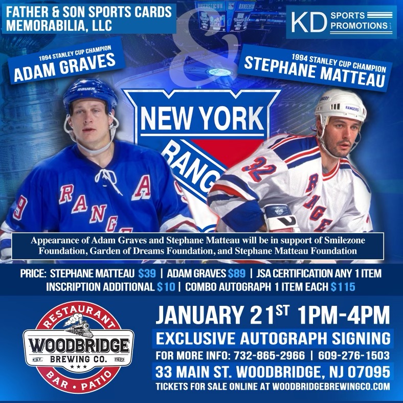 New York Rangers Adam Graves and Stephane Matteau will be hosting an autograph signing event on Jan 21st - 3pm at the Woodbridge Brewing Co. See below for more info and how to purchase tickets.